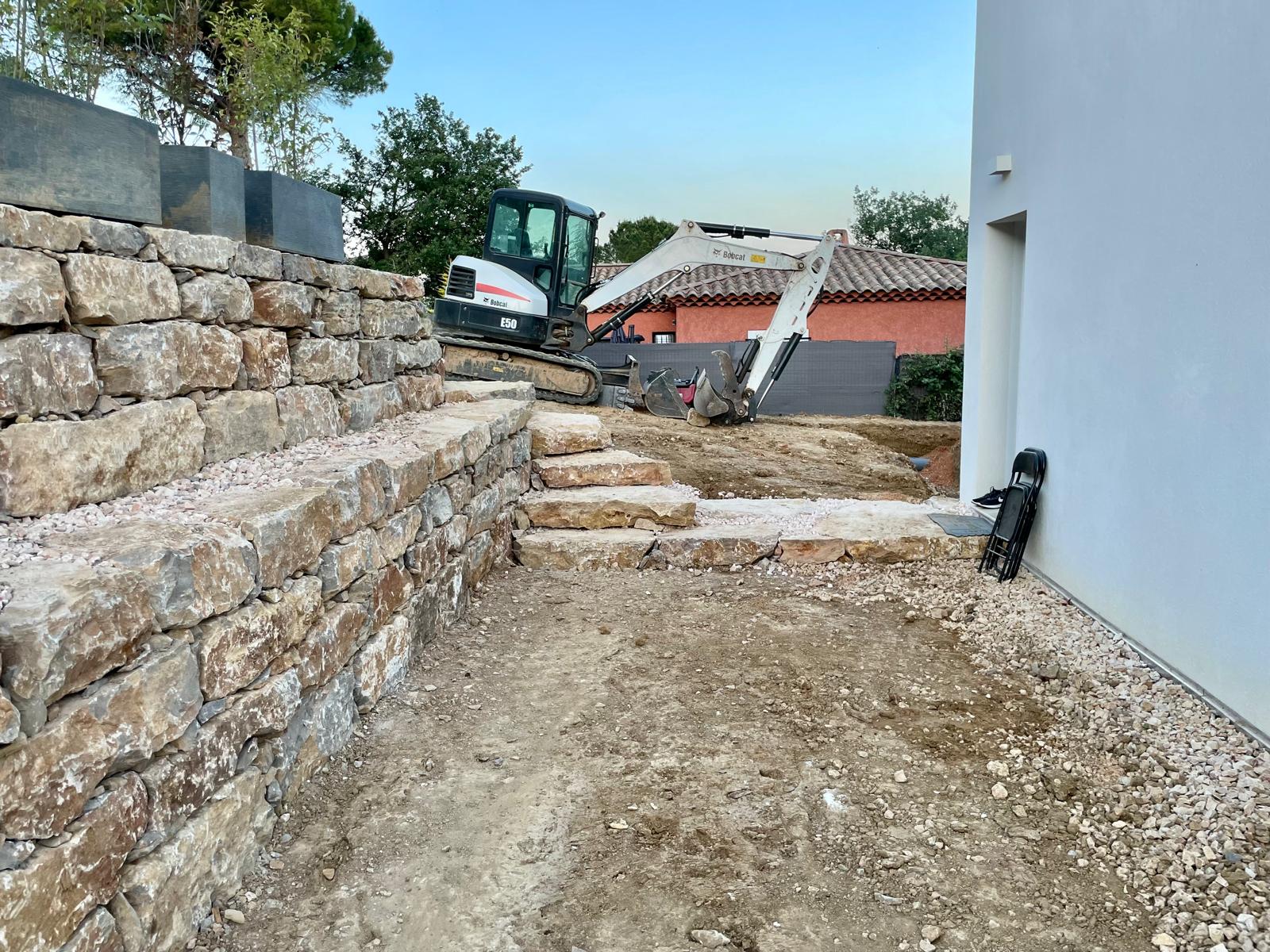 Pour ce faire, nous concevons des espaces propices à la détente et à la convivialité, comme la création de terrains de pétanque et l’aménagement de tours de piscine. Nous réalisons également des empierrements avec des blocs de la région ainsi que des enrochements sur mesure pour stabiliser vos terrains. Nous sommes spécialisés dans divers types de soutènement des terres, notamment la pose de murs en gabion, de murs préfabriqués en béton, et la construction de murs maçonnés avec des finitions en pierre naturelle ou en parement de pierre. De plus, nous sommes compétents dans la pose de blocs pour les murs végétaux, la création d’escaliers extérieurs, l’aménagement de terrasses, la pose de dalles ou le coulage de dallage en béton, ainsi que la création de massifs décoratifs en gravier sec et la plantation d’arbustes, voire l’essouchement si nécessaire.